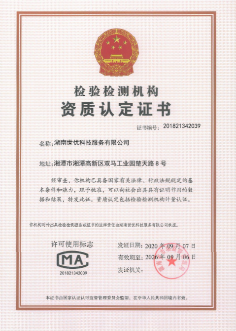 2020年9月,世優(yōu)科服已順利取得了由湖南省市場監(jiān)督管理局頒發(fā)的檢驗(yàn)檢測機(jī)構(gòu)資質(zhì)認(rèn)定證書(證書編號201821342039),標(biāo)志著公司在技術(shù)能力和質(zhì)量管理方面都達(dá)到RB/T214-2017《檢驗(yàn)檢測機(jī)構(gòu)資質(zhì)認(rèn)定能力評價(jià)檢驗(yàn)檢測機(jī)構(gòu)通用要求》的要求。
