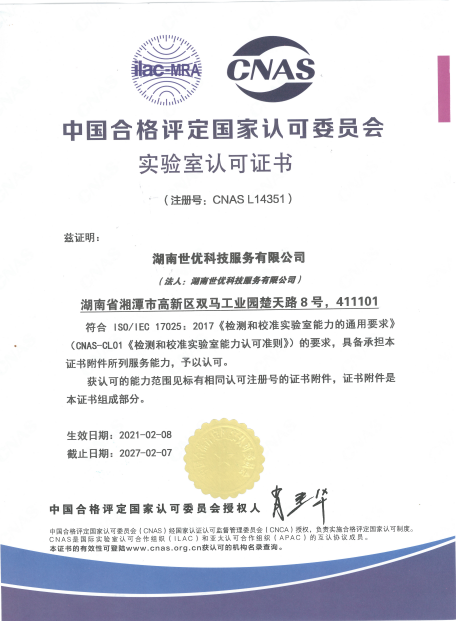 2020年9月,世優(yōu)科服已順利取得了由湖南省市場監(jiān)督管理局頒發(fā)的檢驗檢測機構(gòu)資質(zhì)認(rèn)定證書(證書編號201821342039),標(biāo)志著公司在技術(shù)能力和質(zhì)量管理方面都達(dá)到RB/T214-2017《檢驗檢測機構(gòu)資質(zhì)認(rèn)定能力評價檢驗檢測機構(gòu)通用要求》的要求。