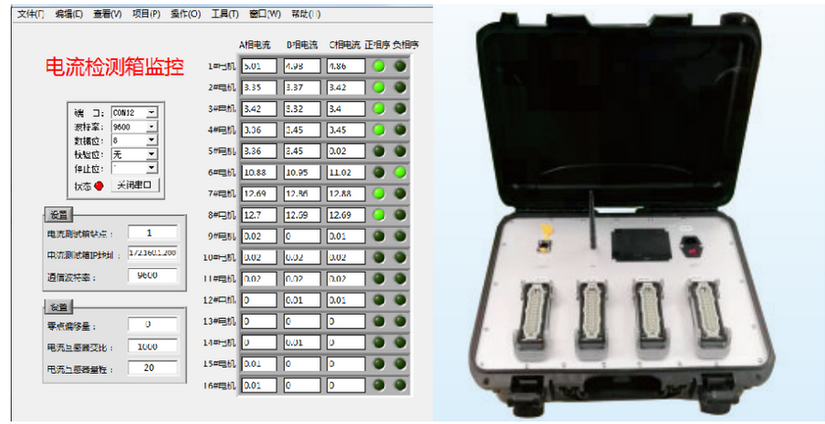 電流檢測(cè)箱是一款可以同時(shí)測(cè)多路三相用電設(shè)備的電流和相序數(shù)據(jù)便攜式設(shè)備,通過(guò)配帶的電流鉗夾,在不改變被測(cè)線路的條件下,單個(gè)電流測(cè)試箱最多可同時(shí)測(cè)量16個(gè)電機(jī)的三相電流和相序,測(cè)試數(shù)據(jù)通過(guò)MODBUS通信協(xié)議傳輸至電腦或PLC,支持二次開發(fā)。